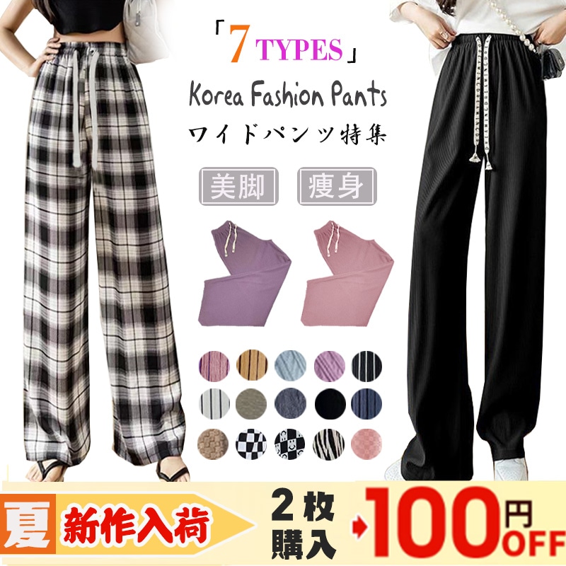 7 types無地イージーワイドパンツ トレンド リブ ワイドレッグパンツ レディース チェック柄ロングパンツ シンプル ゆったり リラックス カジュアル ズボン