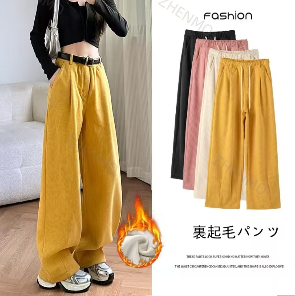 秋冬 裹起毛ワイドパンツ レディース ロングパンツ 厚手 暖かい パンツ 韓国ファッション リブ ワイドレッグパン 無地 シンプル ゆったり リラックス コーデュロイ 美脚 ズボン