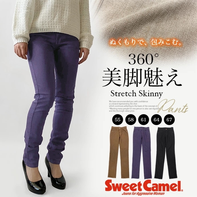 スキニー デニムパンツ カラーパンツ ストレートパンツ ボトムス ストレッチ 細身 股上浅め 小さいサイズ 美脚 脚長 ほっこり 軽量 保温 Warm Wrap Sweet Camel スイートキャメ