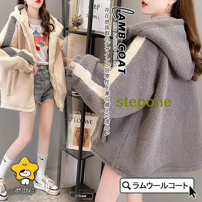 冬アウター ラムウールコート ボアコート レディース ジャケット ムートンコート 折り襟 フード付き ミディアム丈 ルーズコート アウター 着痩せ 中綿ジャケット