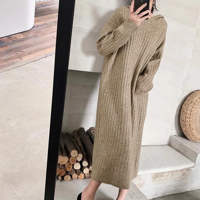 ワンピース 2025秋冬新作 ニットワンピース レディース フード付き 無地 ミディアム丈 膝丈 インナー スキニー ボトム セーターワンピース 韓国ファッション