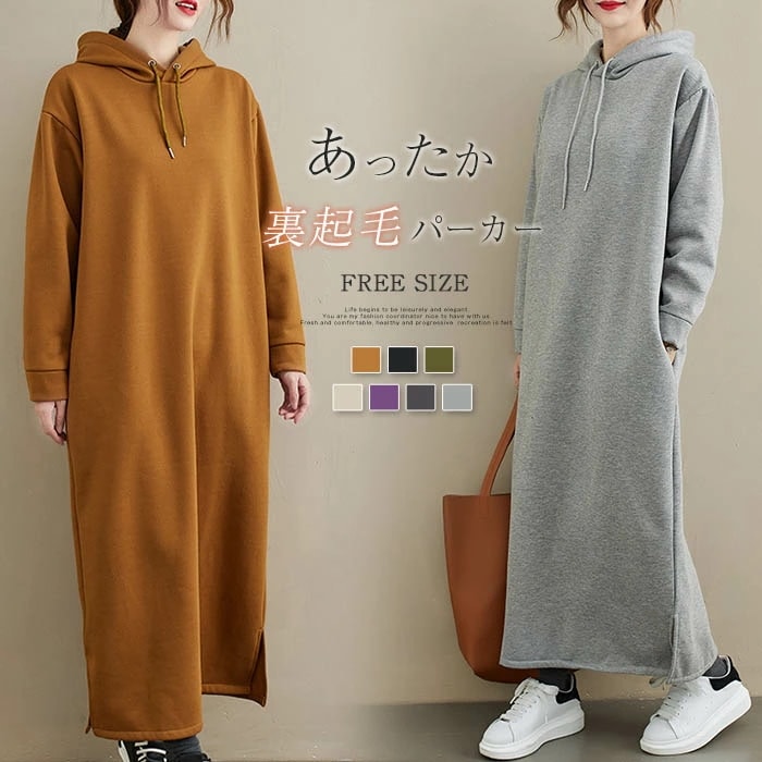 裏起毛 ワンピース レディース 秋冬 スウェット パーカー パーカーワンピース あったか 秋 冬 ロングパーカー スウェットワンピース ロング丈 ミモレ丈 長袖 フード付き トレーナー スリット 厚手