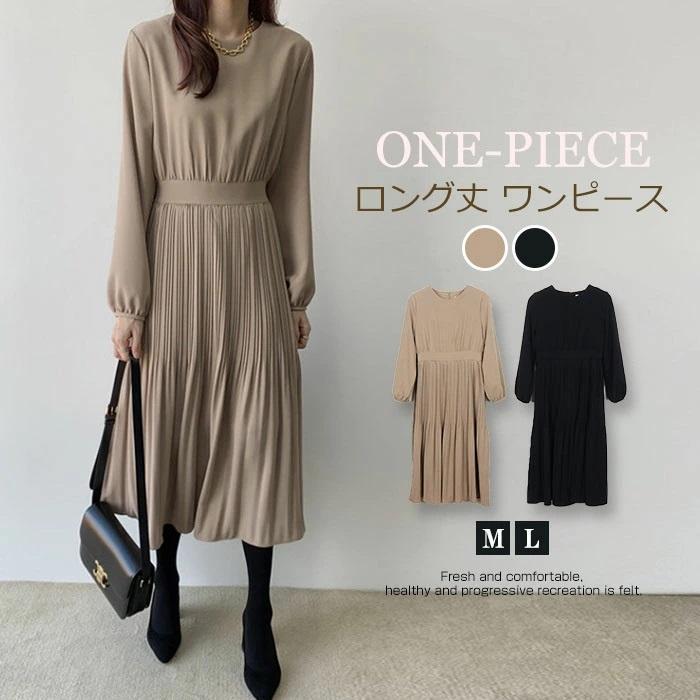 ロングワンピース ワンピース プリーツ ロングワンピ ロング丈 長袖 きれいめ レディース ワンピ 無地 ウエストゴム 大人可愛い 通勤 普段着 OL カジュアル トレ