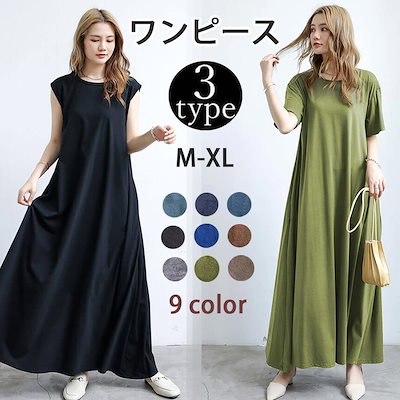 ワンピース マキシ丈ワンピ カジュアル ロング Aライン シンプル 細見え 部屋着 マタニティ 華奢見え ノースリーブ 半袖 長袖 抜け感ドロップショルダー 3タイ