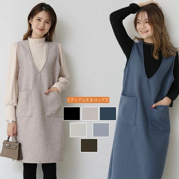 ジャンパースカート 選べる長さ ロング丈 ミディアム丈 スキッパー ジャンスカ ノースリブ 深Vネック ロングワンピース Vネック スリット入り ウール 無地 レイヤード カジュアル オフィス ポケ