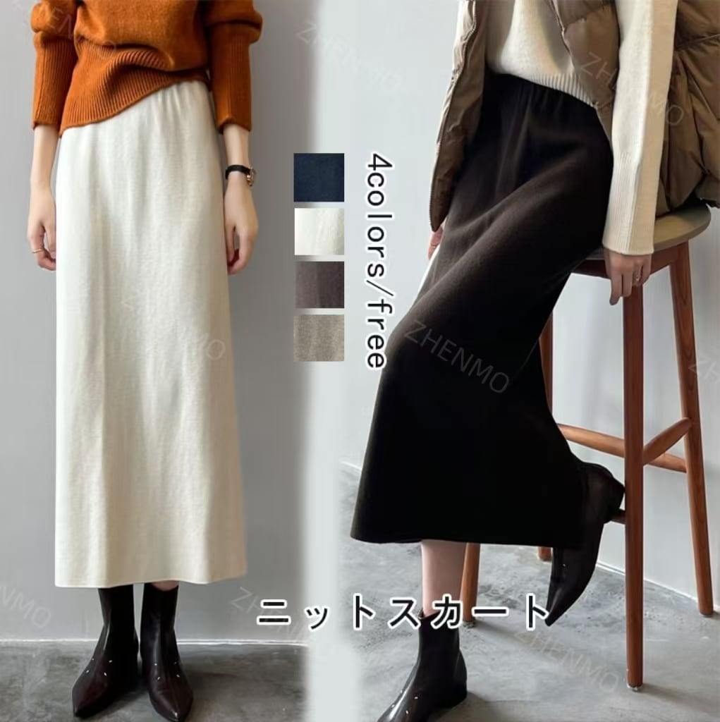 韓国ファッションミディアムスカート 4Color選べま フェミニンラインで上品なニットタイトスカート ニット生地 だから履きやすい 秋 冬 春使用 ニットスカート