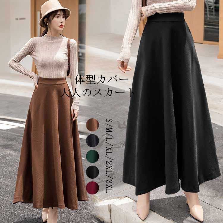 通勤 秋冬 ボトムス 膝下 秋 aライン 大人 フレアスカート ロングスカート ハイウエスト 無地 体型カバー ロンスカ フレア カジュアル スカート aラインスカート 冬 マキシスカート 大きいサイ
