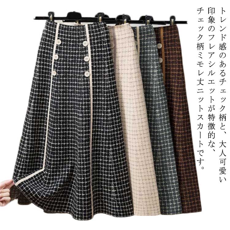 フレアスカート ロングスカート チェック柄 ニットスカート レディース ミモレ丈 Aライン ハイウエスト 秋冬 ストレッチ おしゃれ エレガント 可愛い ボタン 体型カバー 春 秋 冬 S M L X