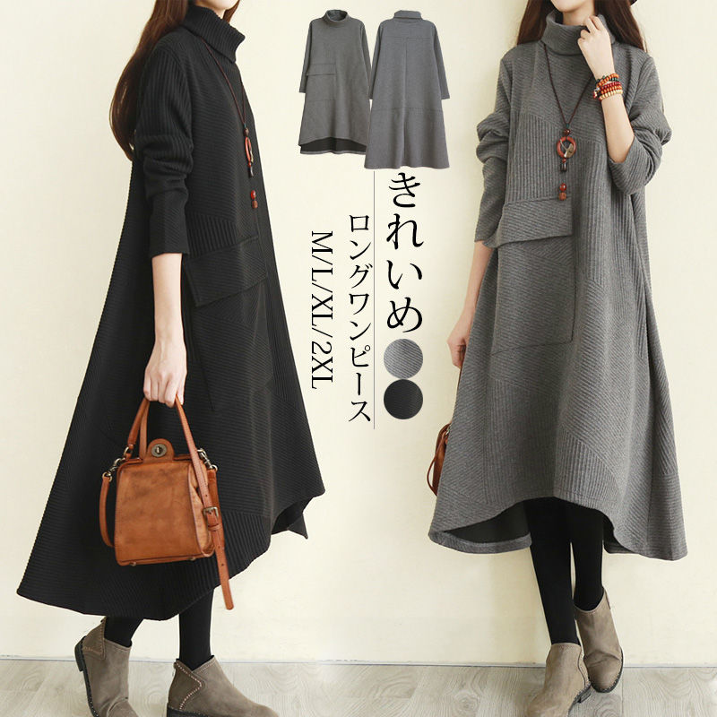 ワンピース レディース 秋冬 ロングワンピース 長袖 チュニック ロングワンピ ミモレ丈 タートルネック ハイネック 無地 マキシワンピース 大きいサイズ 体型カバー ハイネック フレア Aライン 前