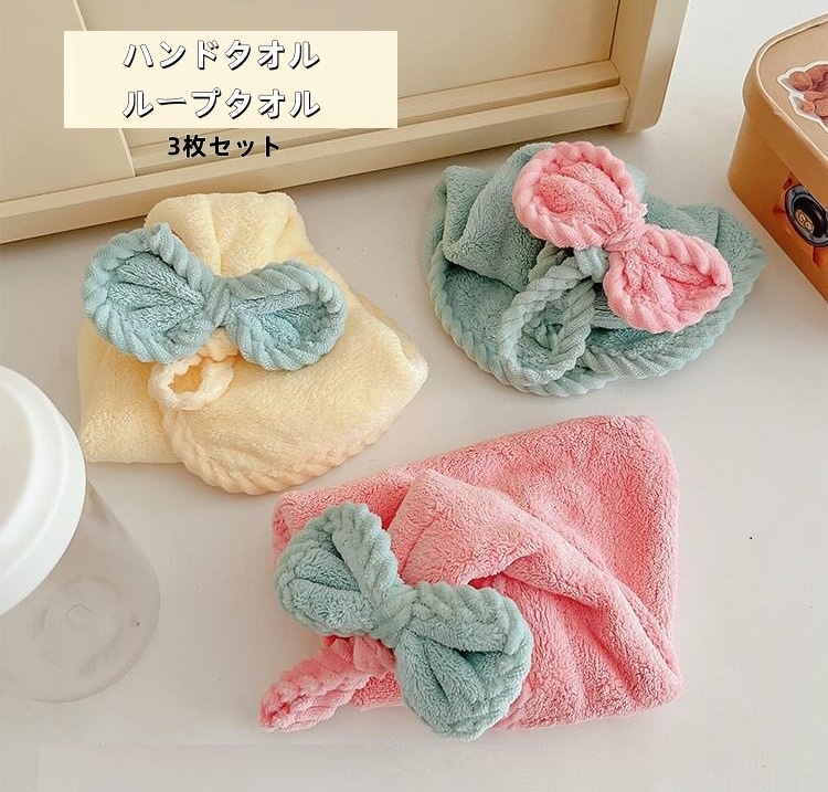 吸水 手ふきん 新生活 台拭き キッチン ハンドタオル ループタオル 3枚セット ループ付き タオル 食器 台所 手拭き 食器拭き リボン おしゃれ 衛生 保育園 幼稚園 布巾