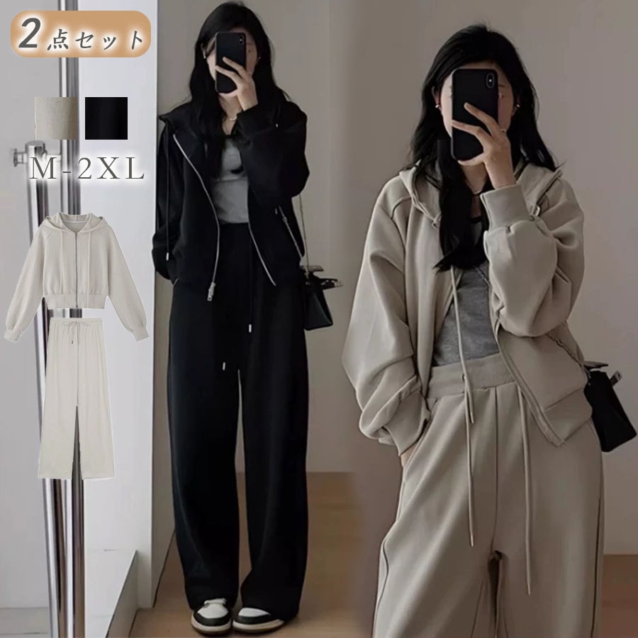 大好評新作 二点セット パーカー+ワイドパンツ無地 薄手 裏起毛スウェット セットアップ 韓国ファッション 脚長効果ズボン ストレート ゆったり カジュアル 着やせ大きいサイズ