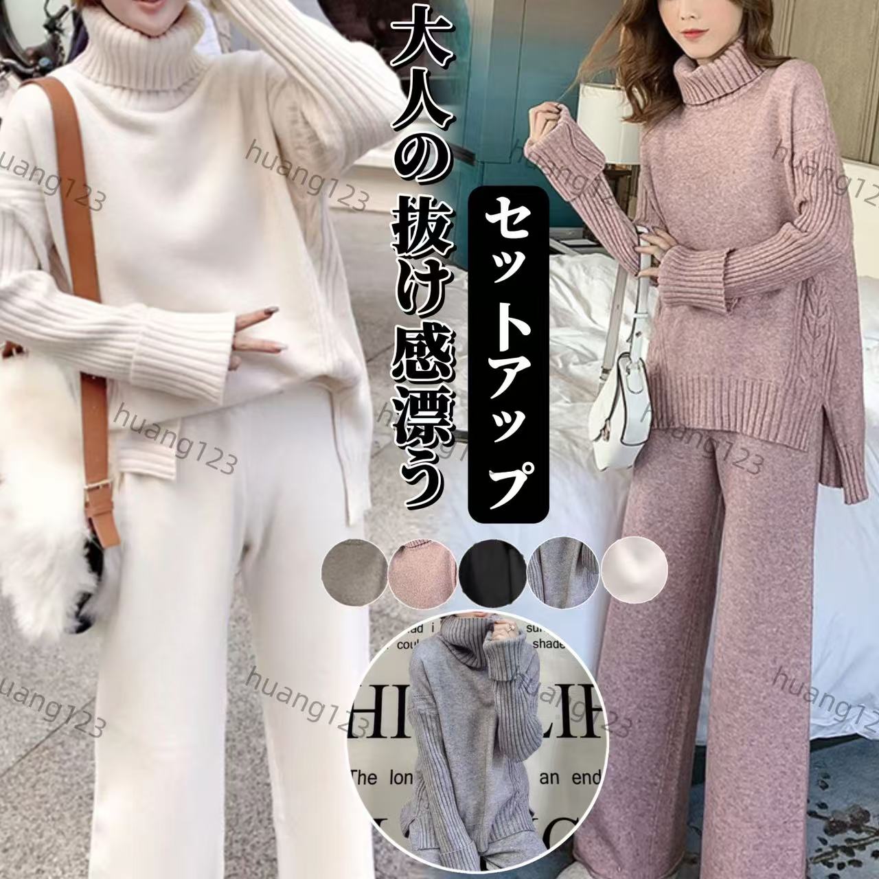 2024レディースニットセット秋冬新作 タートルネックセーター+ワイドパンツ ニット二点セット 怠惰な風 オシャレ 気質 上下レディースセット 通勤 長袖セーター ロングパンツ 二点セット