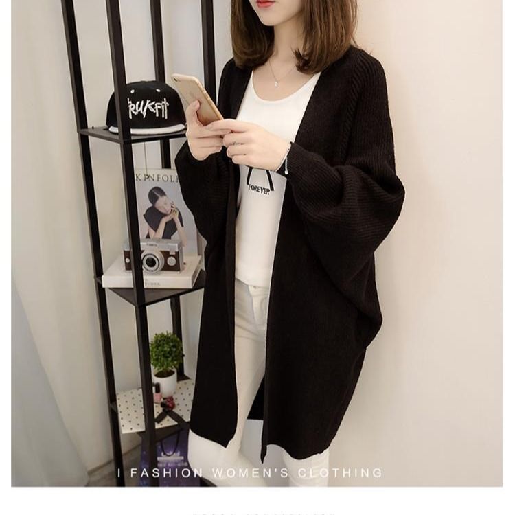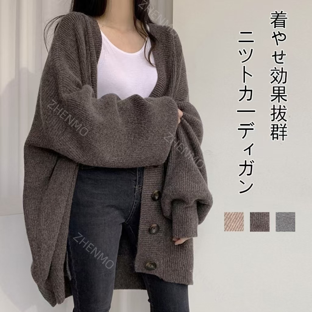 ベーシックニットニットカーディガン ミディアム丈コート秋スタイル学院だるい風Vネックゆったりパフスリーブニットカーディガン女 カーディガン