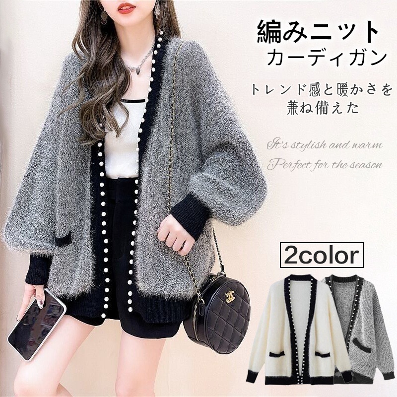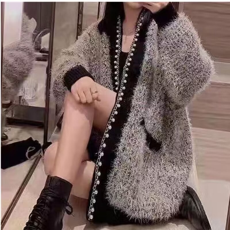秋冬の新作重工釘珠亮糸毛むくじゃらミディアム丈婦人セーターニットカーディガンゆったりモチモチオーバーラッシュ カーディガン