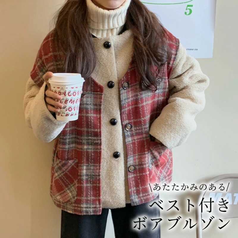 ,,ボア ブルゾン ベスト レディース アウター 秋冬 2点セット アンサンブル レイヤード 厚手 タータンチェック 無地 白 大きいサイズ オーバーサイズ ドロップショルダー ベースボールカラー ポ