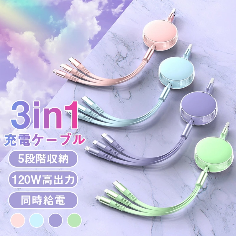 3IN1充電ケーブル TYPE-C MicroUSB LIGHTNING充電ケーブル 携帯充電 断線防止 急速充電 収納便利 持ち運び 巻き取り スタンド 巻き取りスッキリ収納 5段階の長さ調節