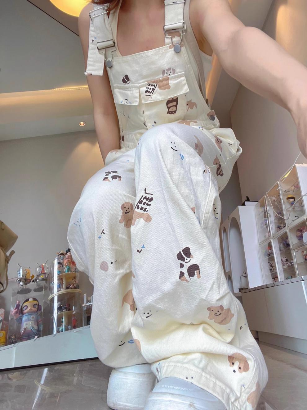 アプリコット楽しい子犬の漫画デニムバックパンツ女性2024秋の新しいストレート緩いワイドレッグジャンプスーツ潮 その他 パンツ