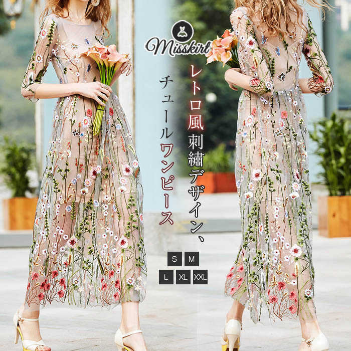 ワンピース ロング ワンピ レディース ロングワンピース 刺繍 花柄 チュール ラウンドネック プリント 五分袖 春 夏 プルオーバー 体型カバー 着瘦せ レトロ 中華風 リゾート風 エレガント セレ