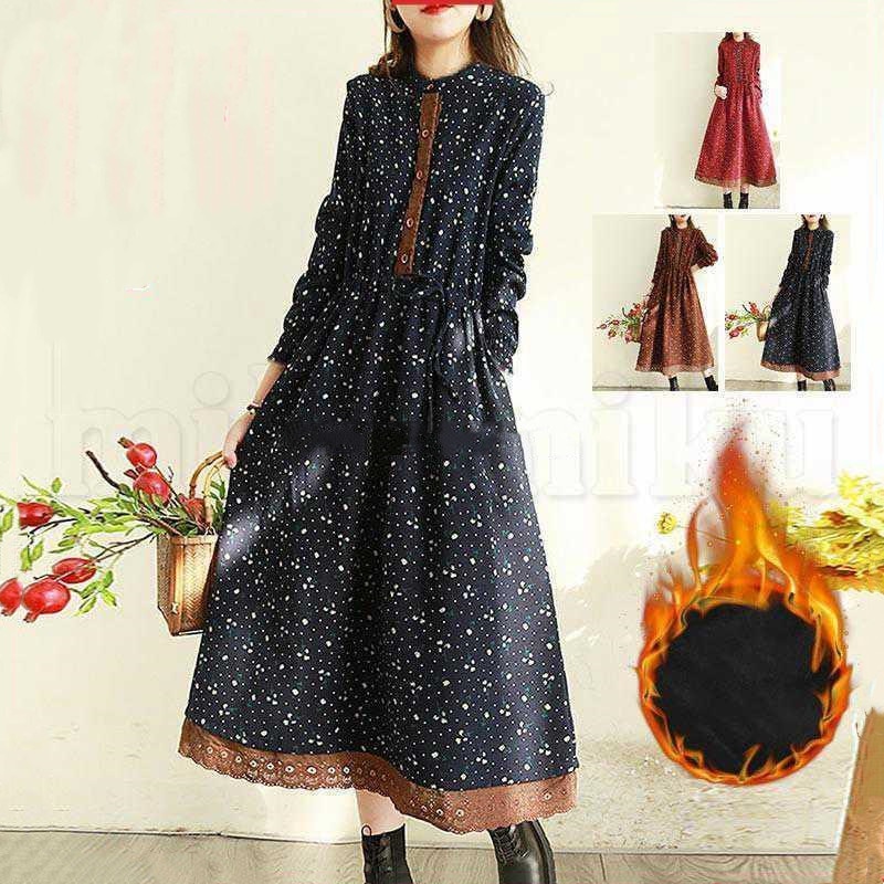 シャツワンピース レディース ロングワンピース 花柄 長袖 レース付き 紐付き 厚手 裏起毛 ス カジュアル ボタン付き 暖かい 秋冬 おしゃれ