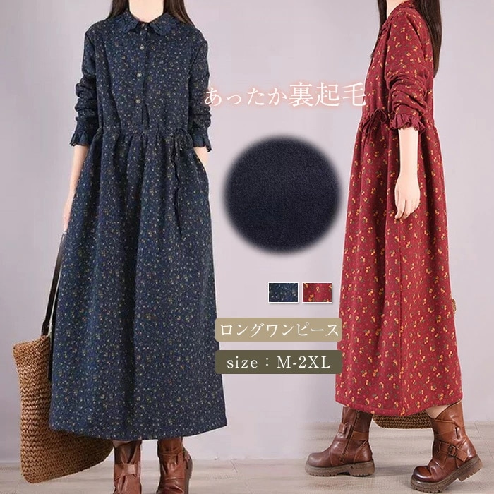 花柄ワンピース 春 aライン ロング ミモレ丈 シャツワンピース ワンピース レディース 秋冬 裏起毛 長袖 ロングワンピース 裏起毛ワンピ 花柄 裏ボア 大きいサイズ 体型カバー ゆったり おしゃれ