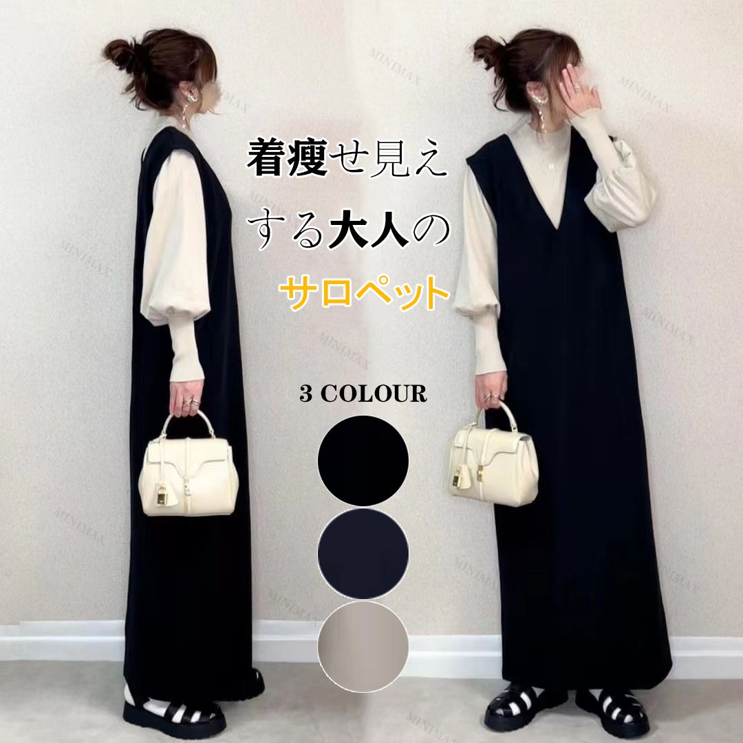 ワンピース サロペット オールインワン Vネック ロング丈 カジュアル ゆったり 体型をカバー 重ね着 レイヤード マタニティ オフェス 通勤 レディースファッション 20代 30代 40代 50代