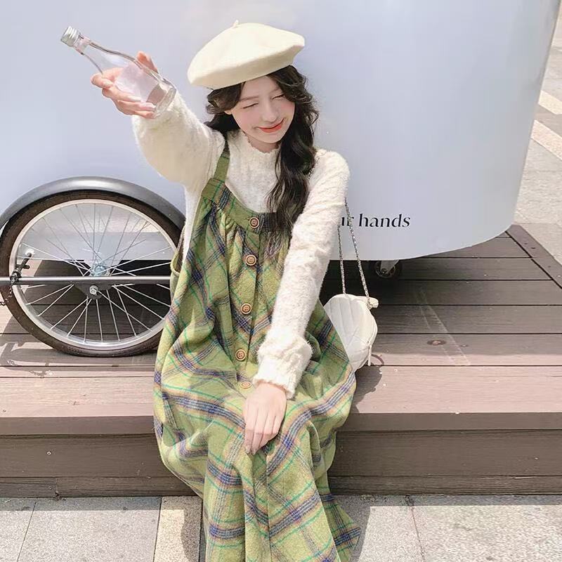 ギンガムチェック風サロペットスカート秋冬細毛見えワンピースオールインワン宮廷風レースシャツ2枚セット セットアップ