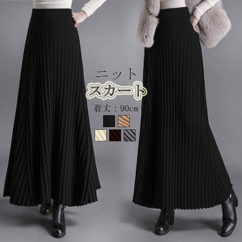 冬 マキシ丈 ロング丈 OL スカート オフィス 秋 ニットスカート ボトムス プリーツスカート aライン フレア レディース ニット マキシ ハイウエスト ロングスカート マキシスカート リブ 黒