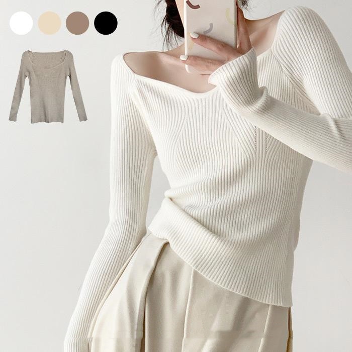 ニットトップス レディース 春 夏 春夏 黒 白 タイト ニット トップス 長袖 リブニット Vネック セーター ブラック ホワイト アイボリー ベージュ