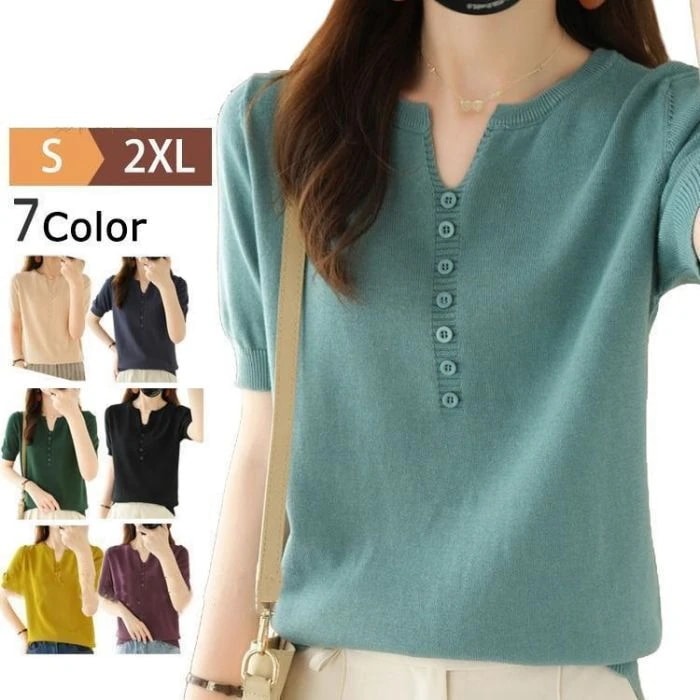 サマーニット 半袖 Tシャツ レディース Vネック トップス サマーセーター ゴルフウェア 無地 春夏 きれいめ オフィス 洗える ニット
