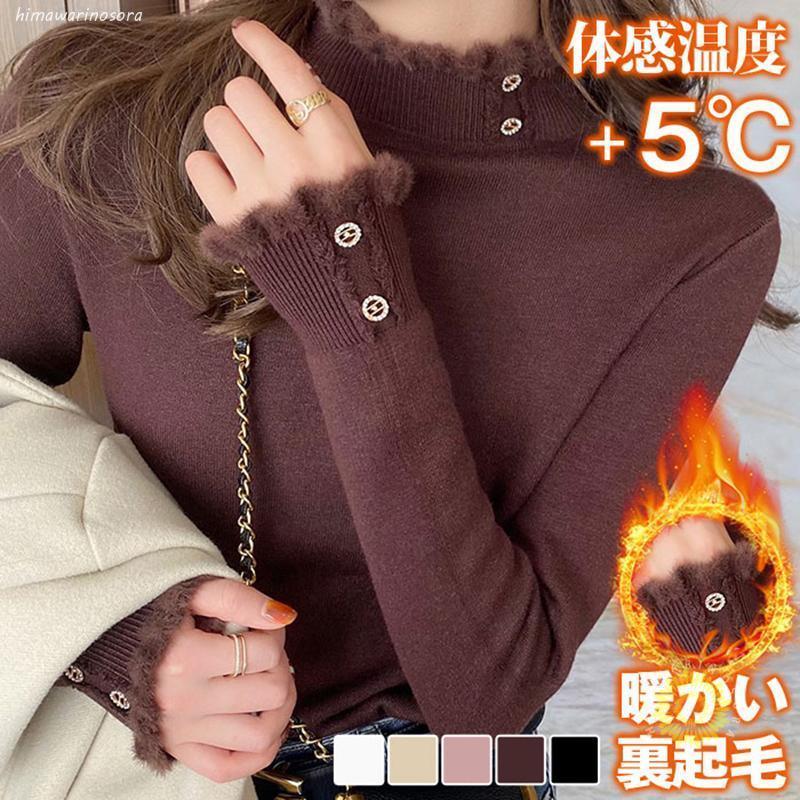 ニットセーター 裏起毛 レディース ハイネックネック シャギーニット厚手 ハイネック 裏ファー ボタン飾り インナー 保温 防寒 蓄熱 Tシャツ カットソー