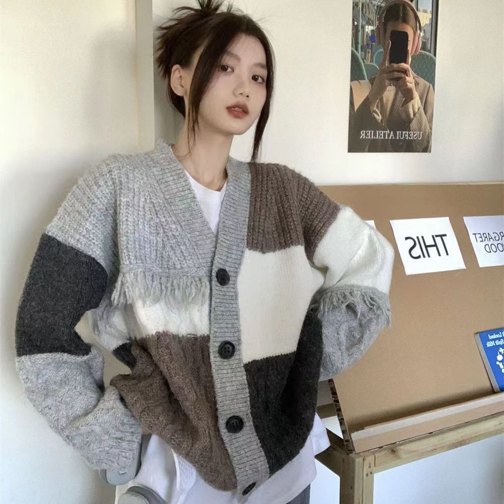 レデイース服トップスニット2025春新品可愛いレース拼接れ長袖Vネックニットセーター レディース ゆったりフィット ロングカーディガン3colour春秋通勤通学S-3XL
