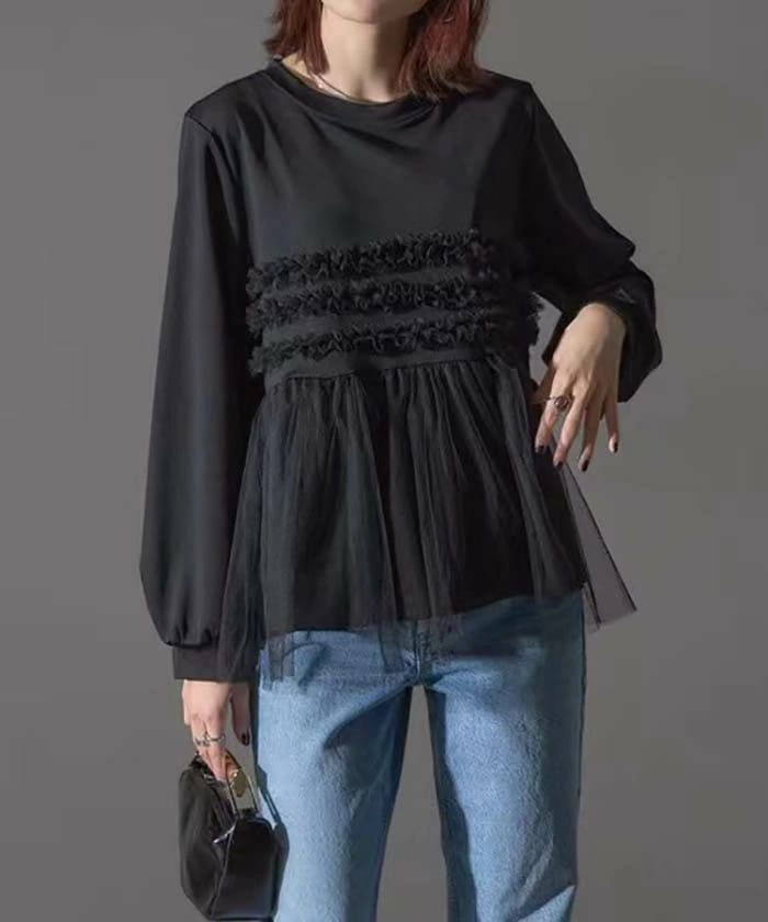 セーター レディース チュール セーター 長袖 秋 春 冬 カレッジ ニット チュール切り替え カットソー チュニック ゆったり 重ね着 レイヤード風 チュールニット 体型カバー シンプル カジュア