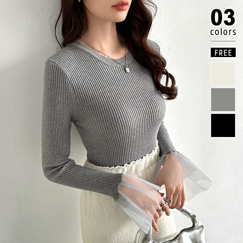 チュール袖ニット ベルスリーブ リブニット 映え袖 ニット チュール フレアスリーブ トップス レディース 長袖 クルーネック チュールスリーブ 切り替え シアー オケージョン