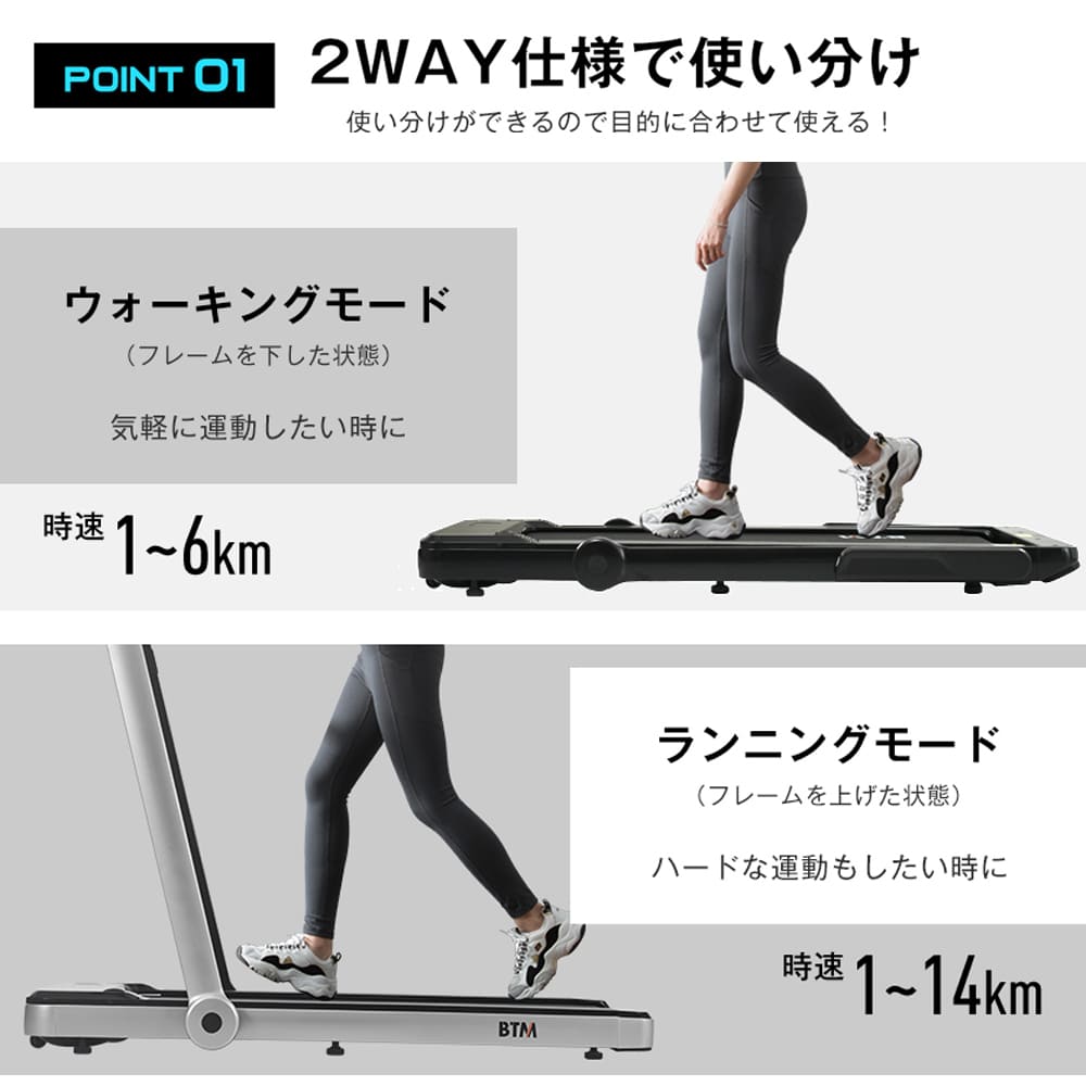 【2 WAY仕様で使い分け】使い分けができるので目的に合わせて使える! ウォーキングモード (フレームを下した状態) 気軽に運動したい時に 時速1~6km ランニングモード (フレームを上げた状態) ハードな運動もしたい時に 時速1~14km