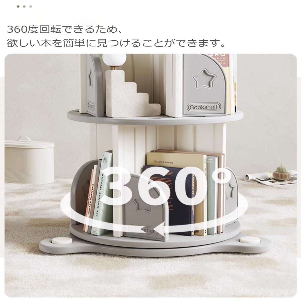 回転式本棚 飾り棚 絵本棚 360°回転本棚 コミック収納棚 本棚 HDPE製 大容量 回転ラック 組立簡単 省スペース 3段 子ども部屋収納 Grey+White Plastic