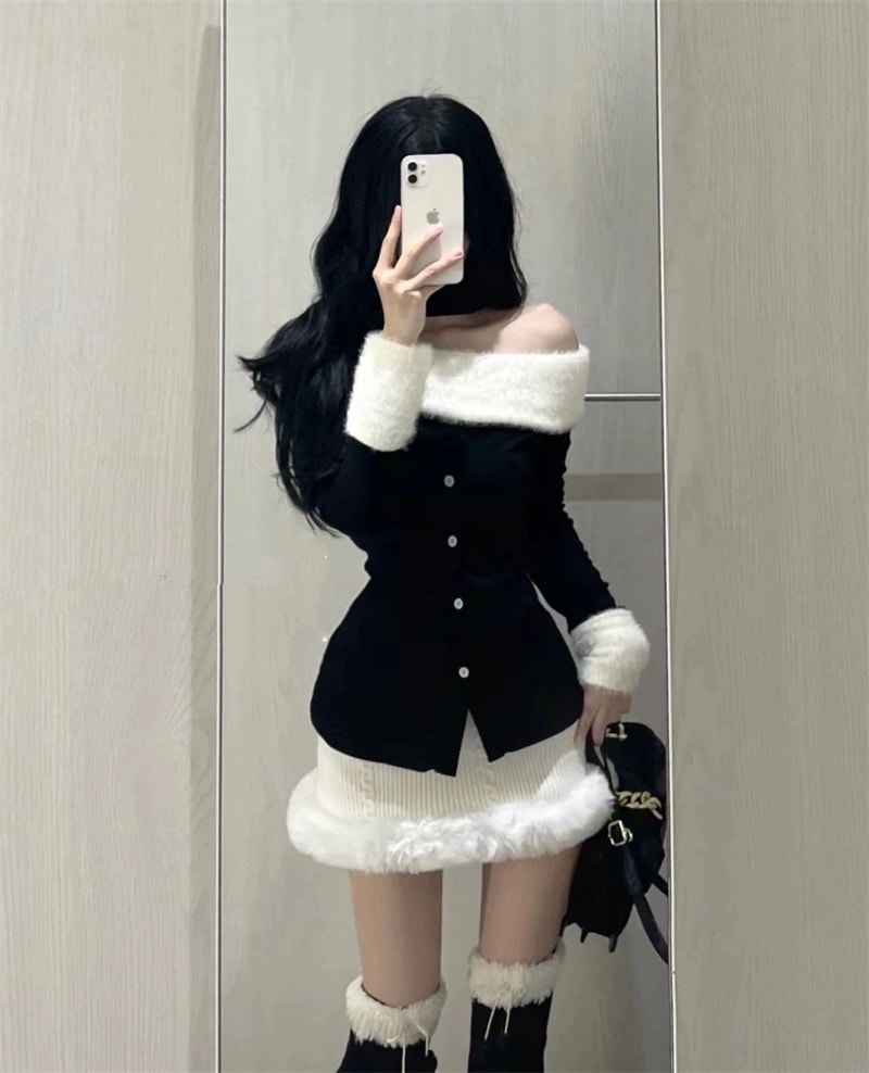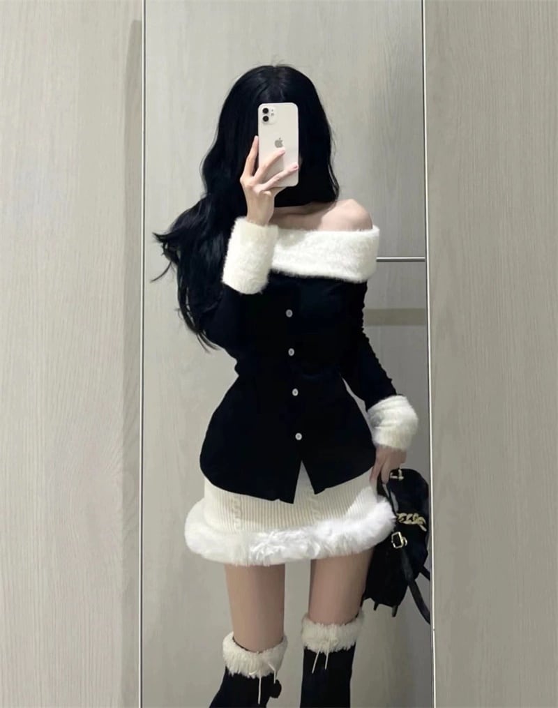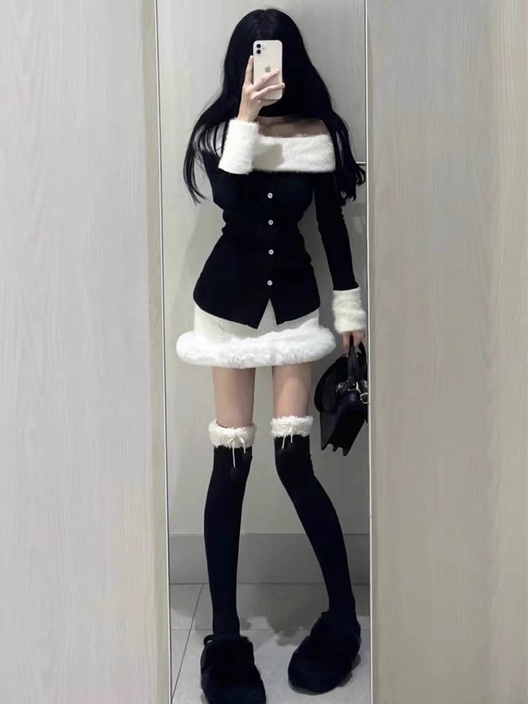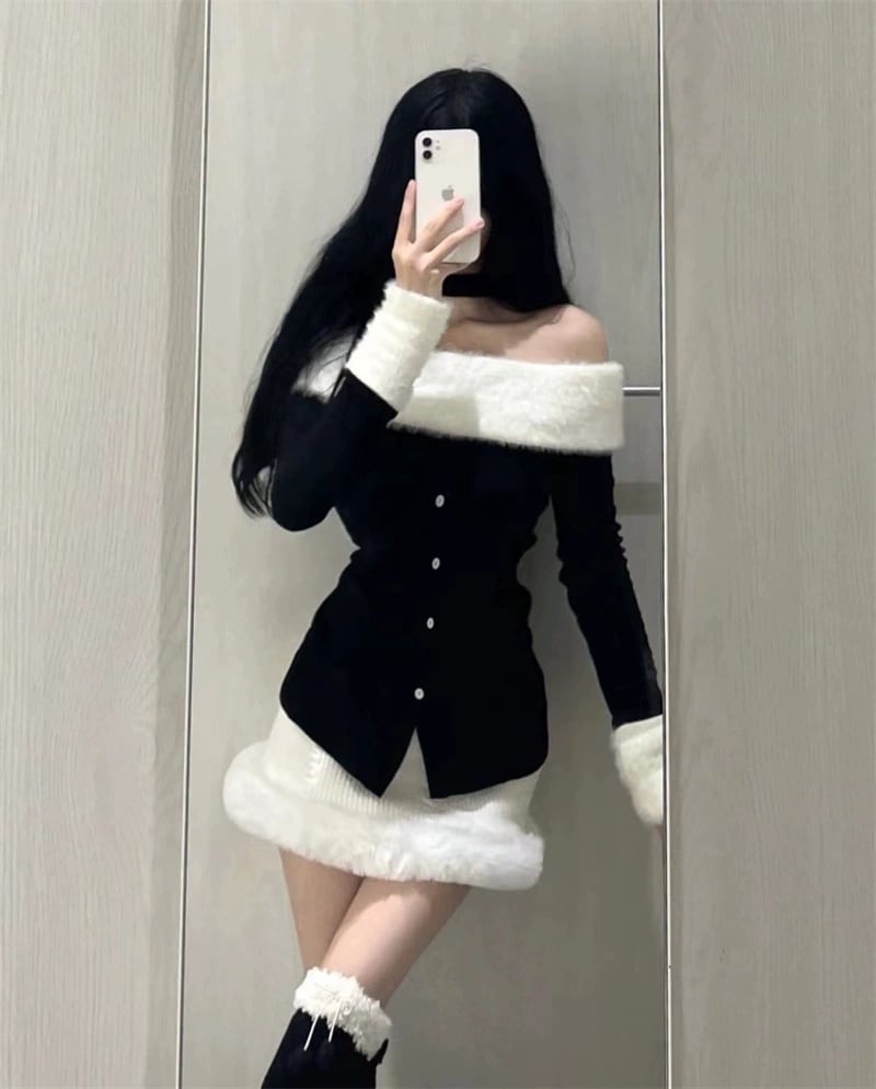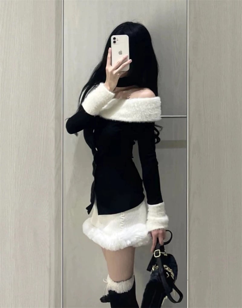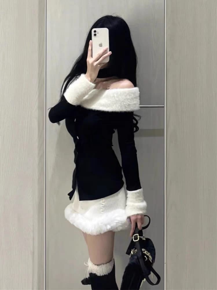 FREE1色韓国デザイン長袖ニットスーツスカートワンショルダーぬいぐるみパッチワイクセーター秋冬ヒップ包みショートスカート2ピースセット
