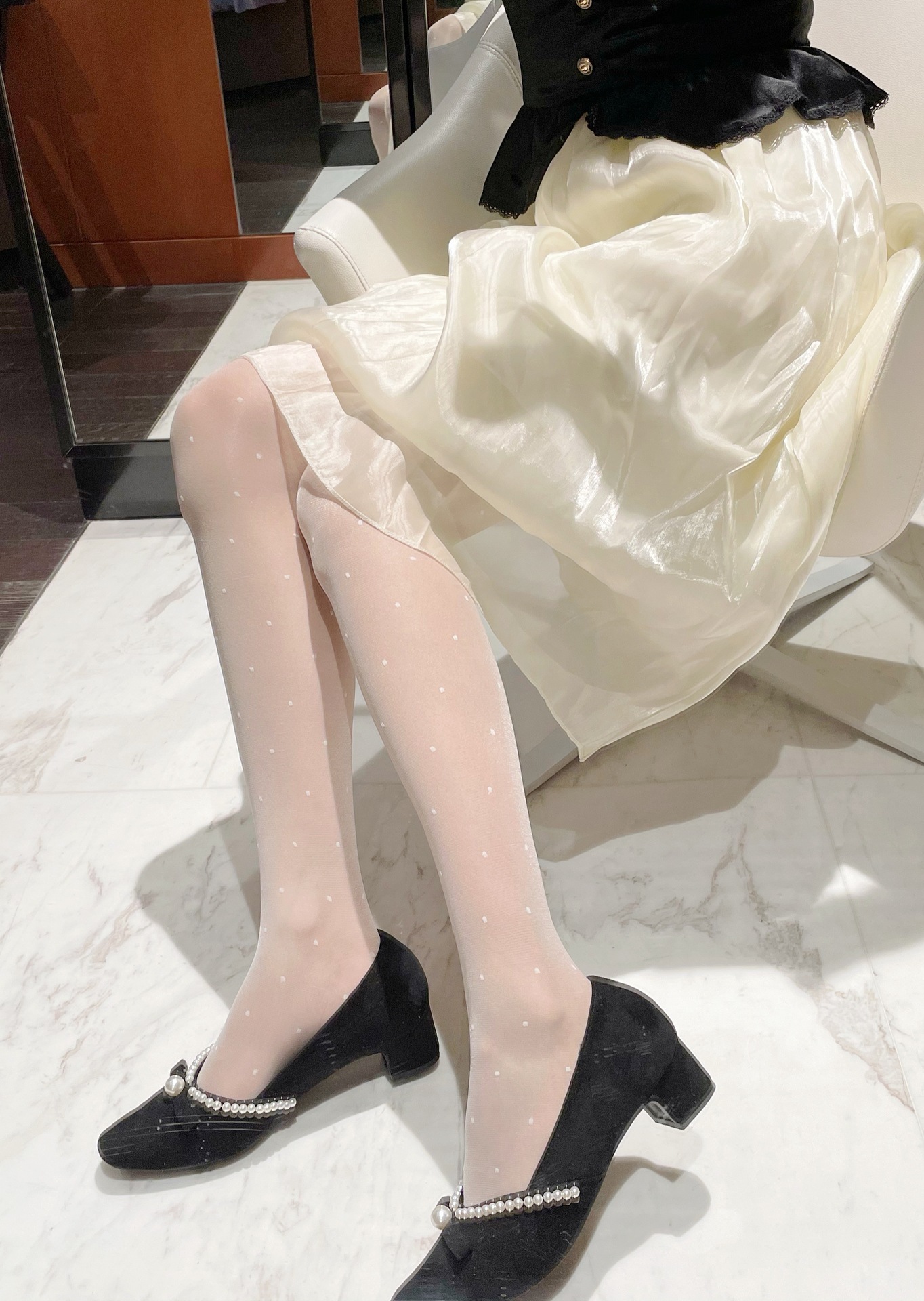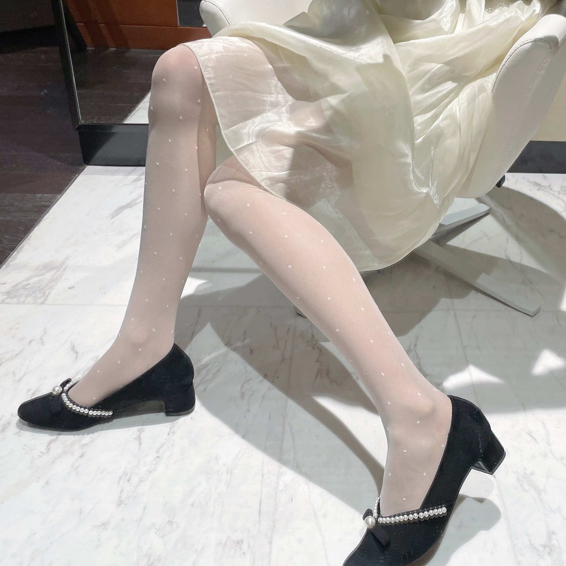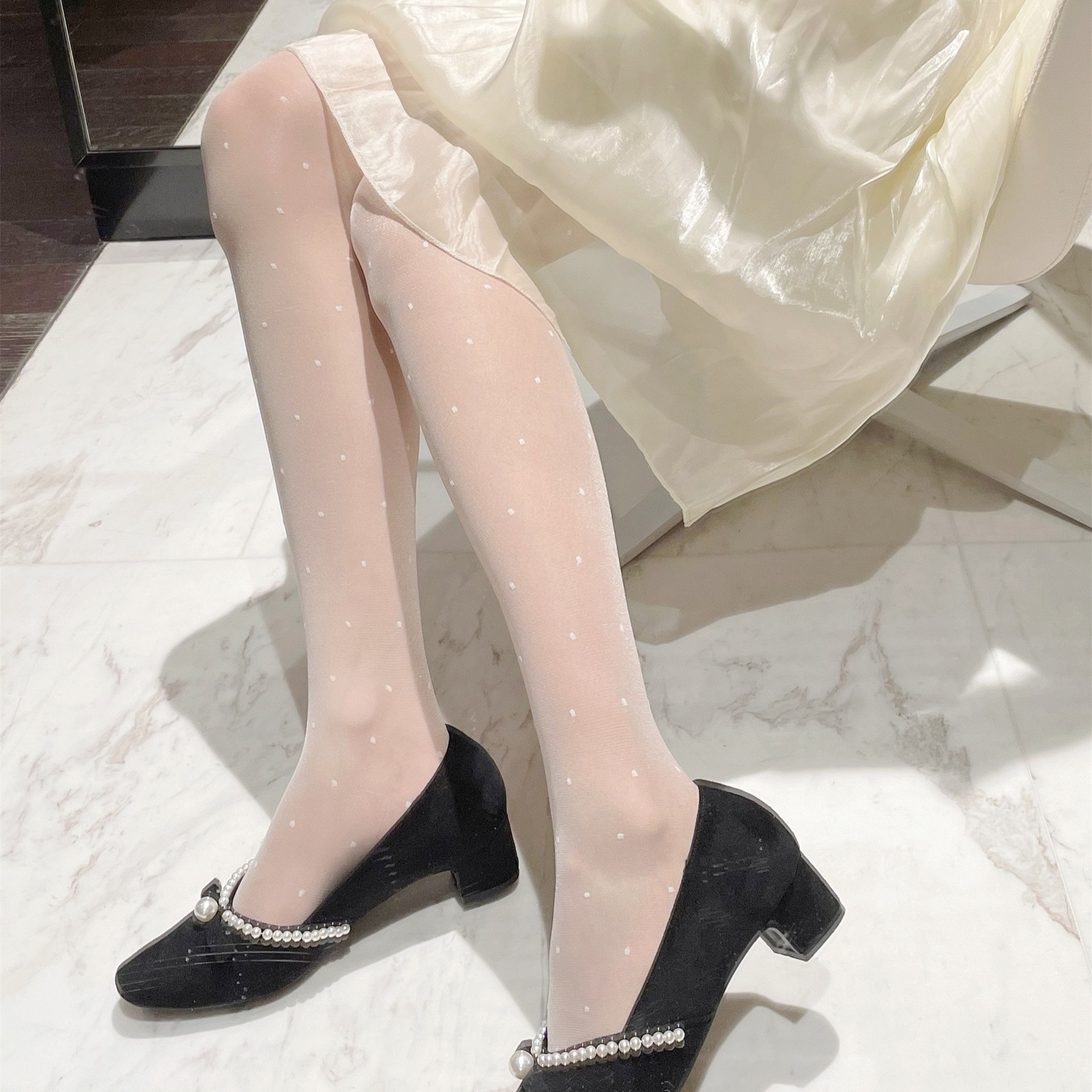 三点セット 優しいレトロなドット水玉レース白ストッキング黒絹パンスト ストッキング