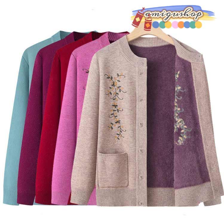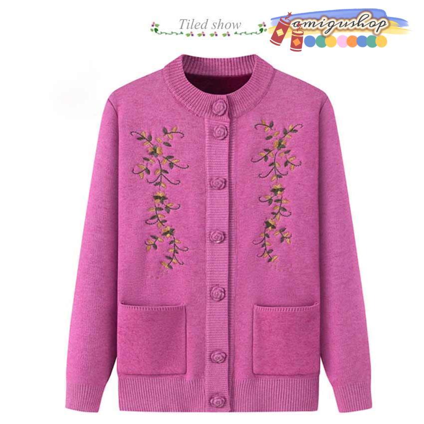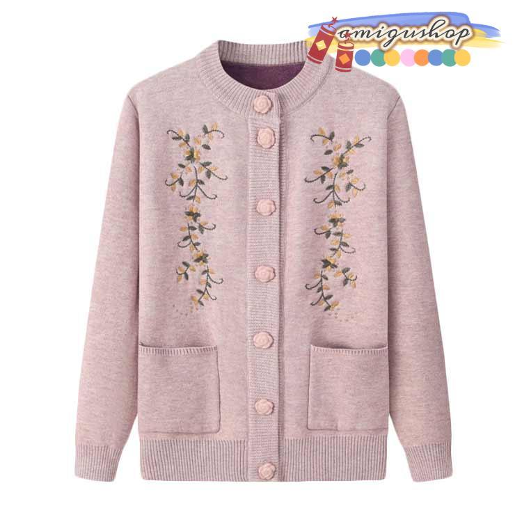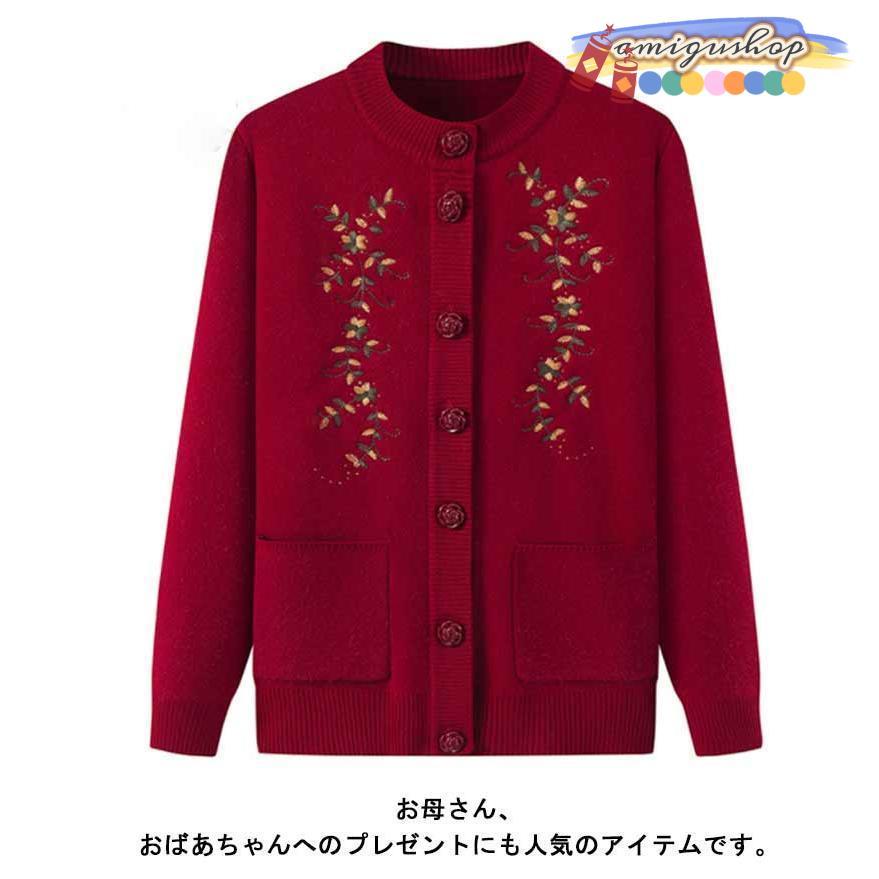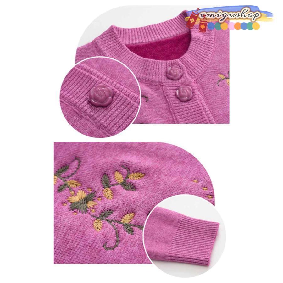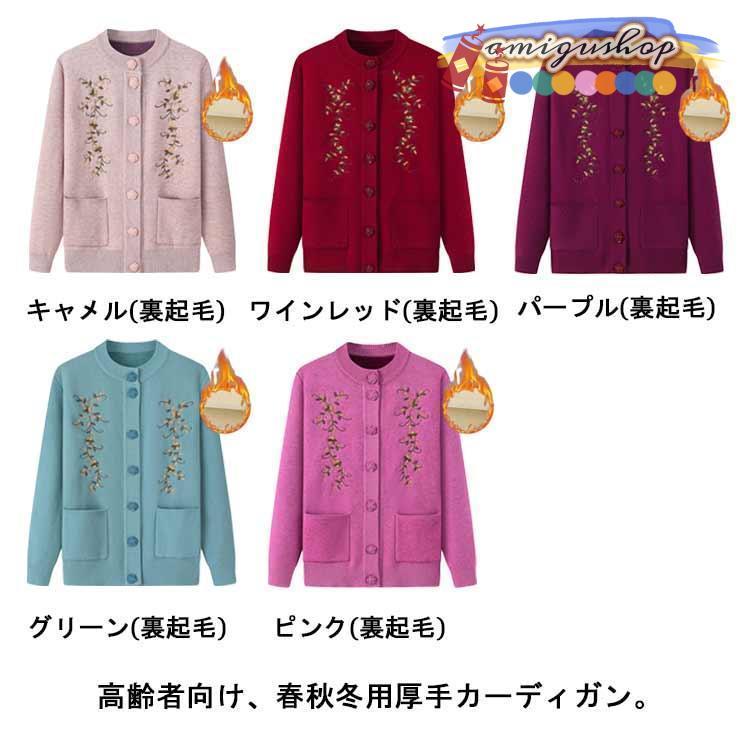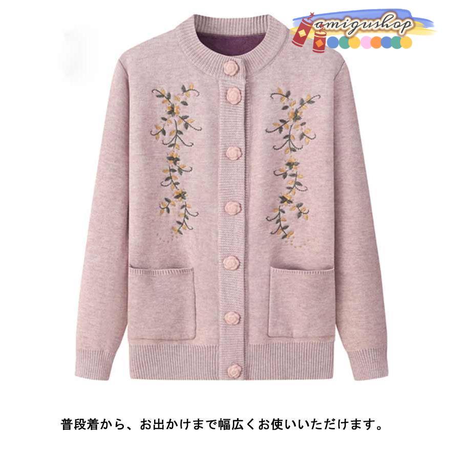 シニアファッション ニットカーディガン レディース 春 秋 冬 セーター ニット 花柄 前開きボタン 薄手 裏起毛 暖かい おばあちゃん 防寒 寒さ対