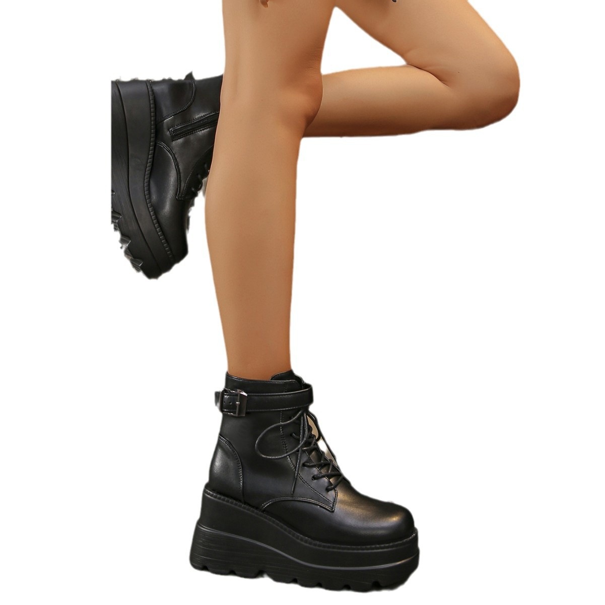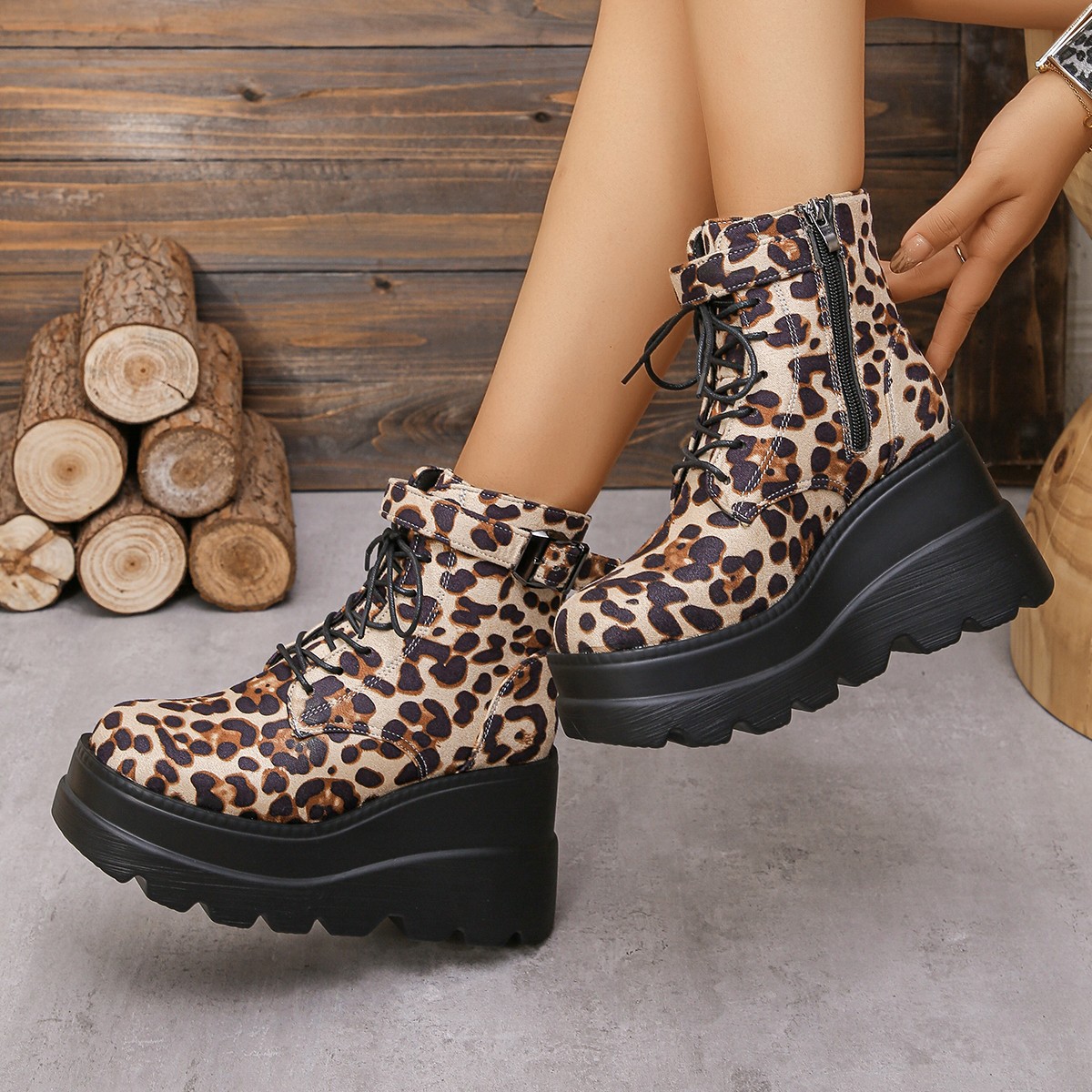 2024秋冬ヒョウ柄ラウンドトゥサイドジッパー厚底ウェッジファッションブーツ ショート ミドルブーツ