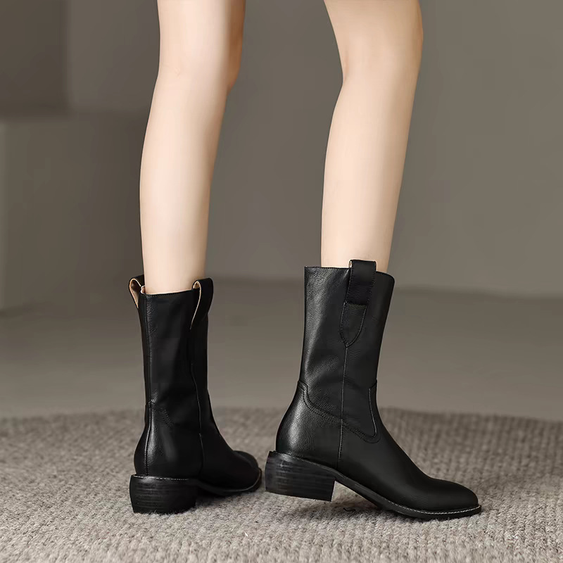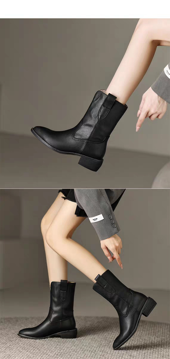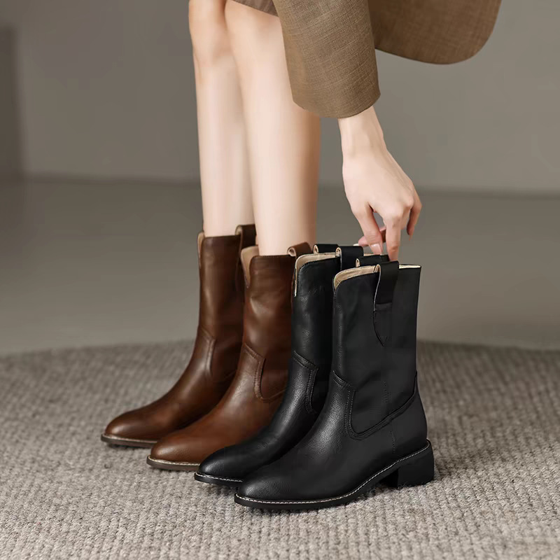 ブラウンレトロポインテッドトゥv口ウエスタンナイトブーツ2024秋冬英国風袖太ヒールレディースミッドカーフシューズ ショート ミドルブーツ