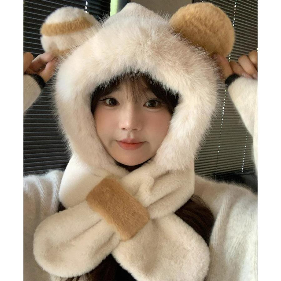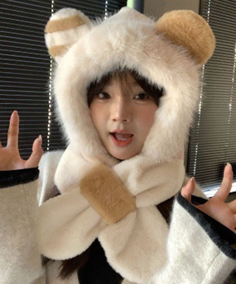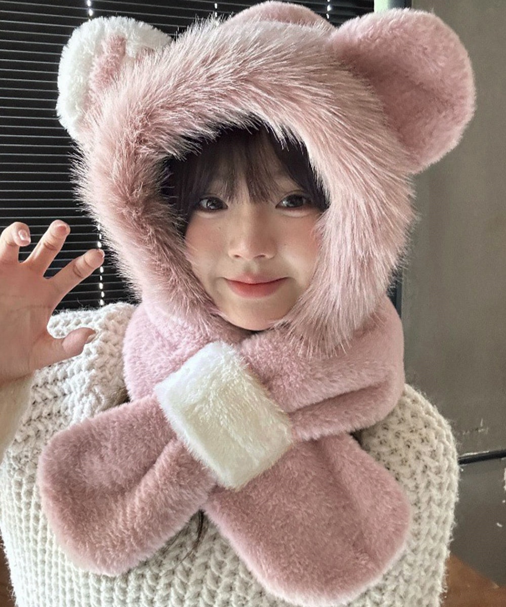 人气 新作 くまみみ帽子 マフラー付きファー帽子暖か スヌード