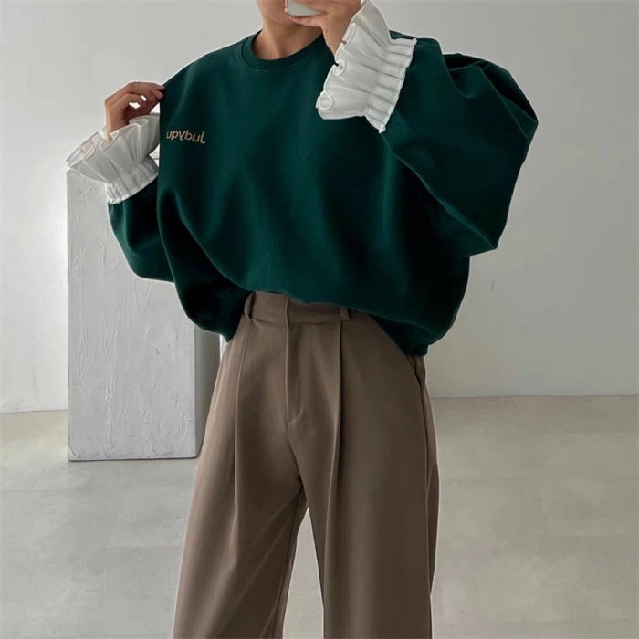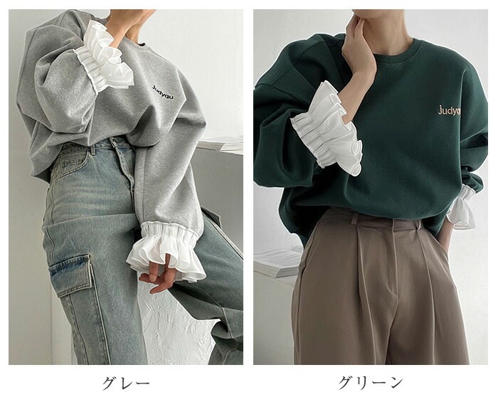 フリル袖トレーナー レディース 春 秋 長袖 トップス スウェット トレーナー 異素材切り替え フリル袖 無地 シンプル ゆったり カジュアル ボリューム袖 大きいサイズ ゆるっと 重ね着風 着瘦せ