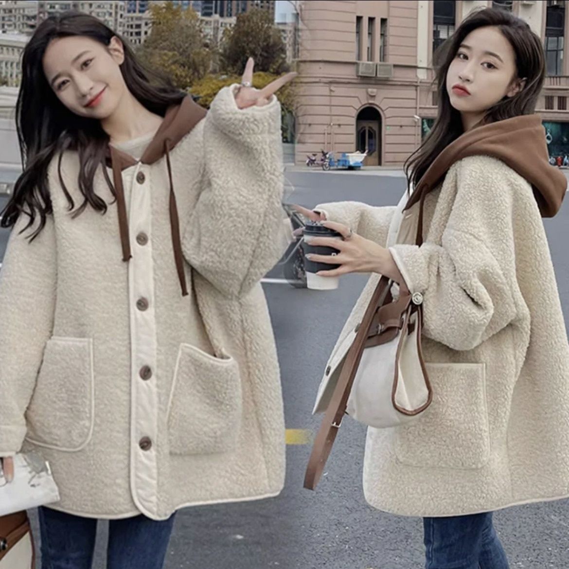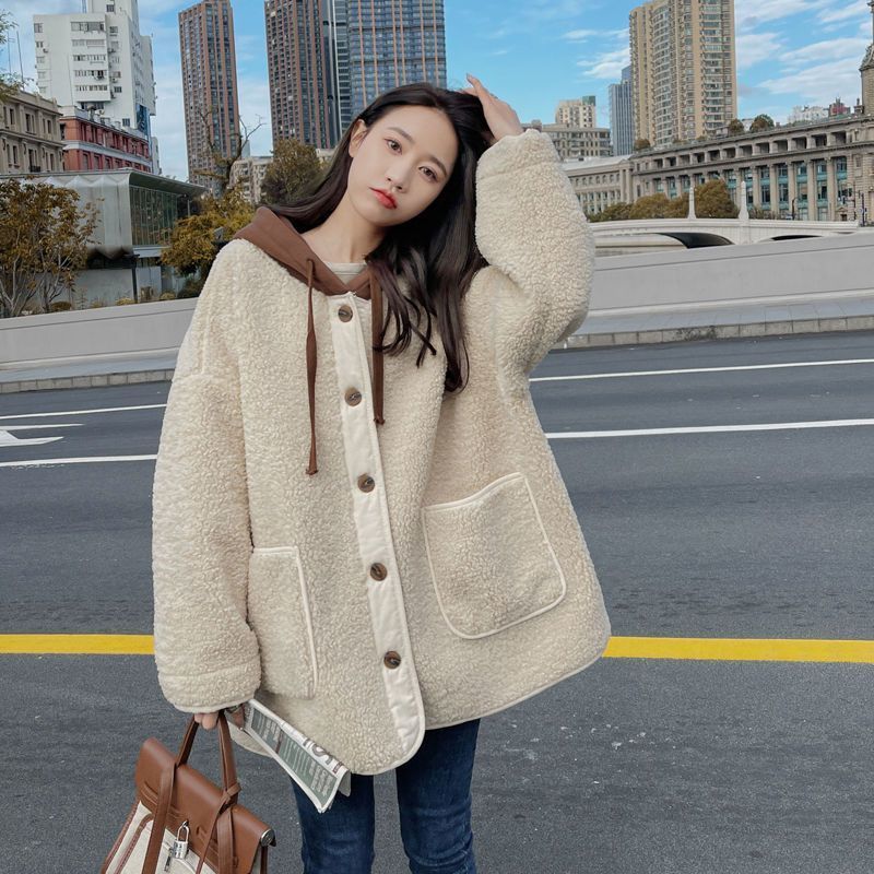 ラシャ 毛皮一体ラムコート秋冬2024新モデル韓系ゆったりパッチワークデザイン感フード付き厚手の上着 トレンチコート