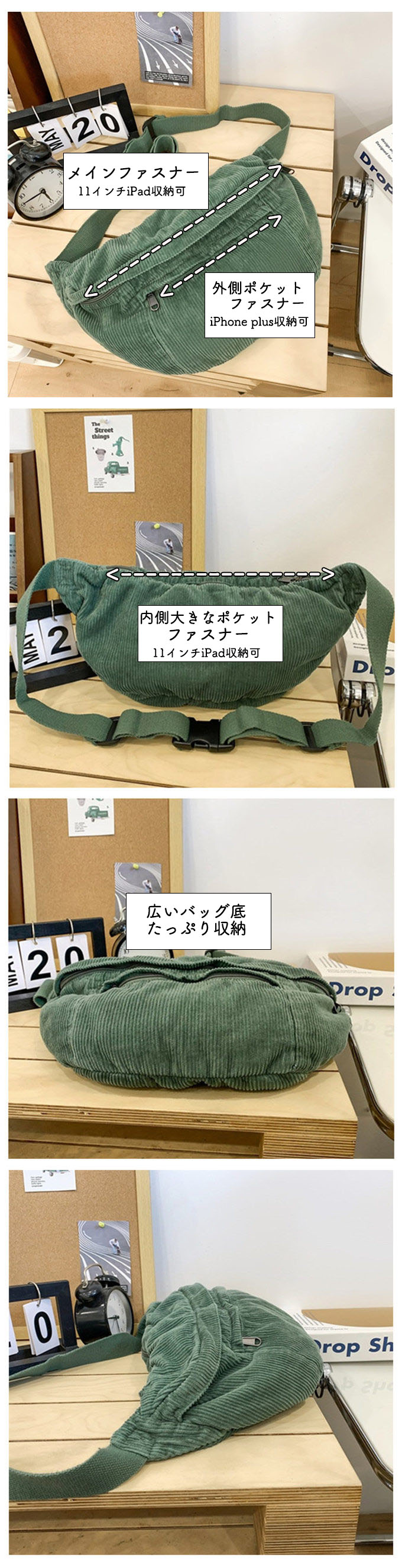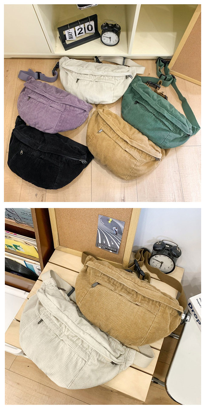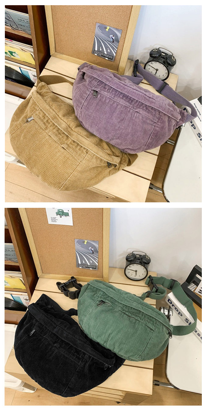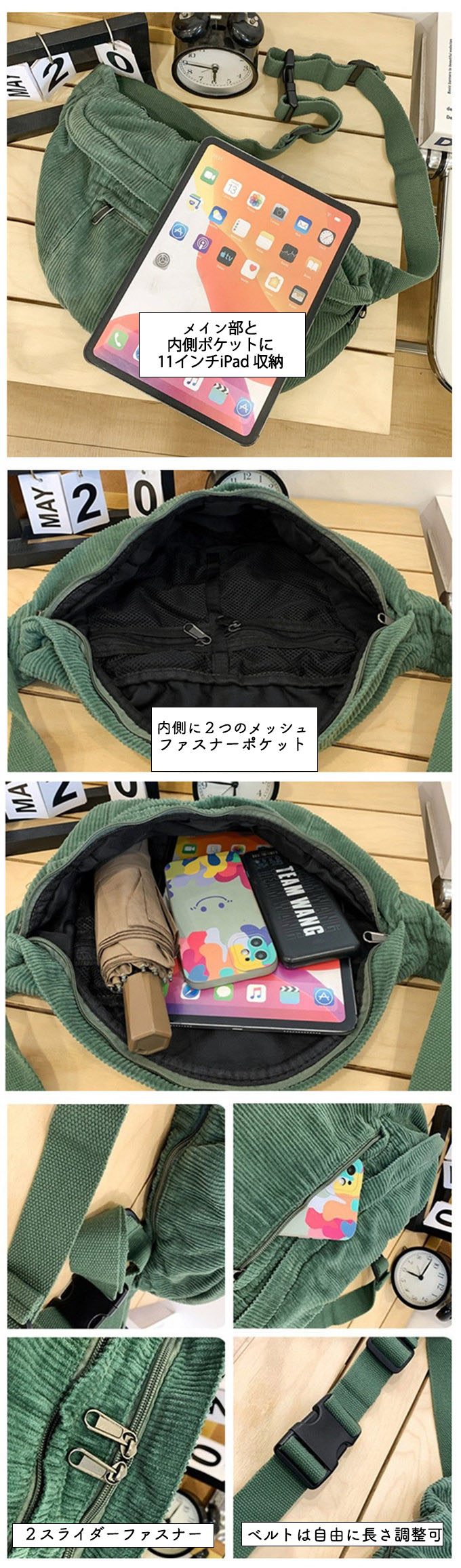 大きめ コーデュロイ メッセンジャーバック サコッシュバッグ リポーターバッグ レディース メンズ 男女兼用 たっぷり収納 外側2ポケット メッシュポケット 斜め掛け ブラック 黒