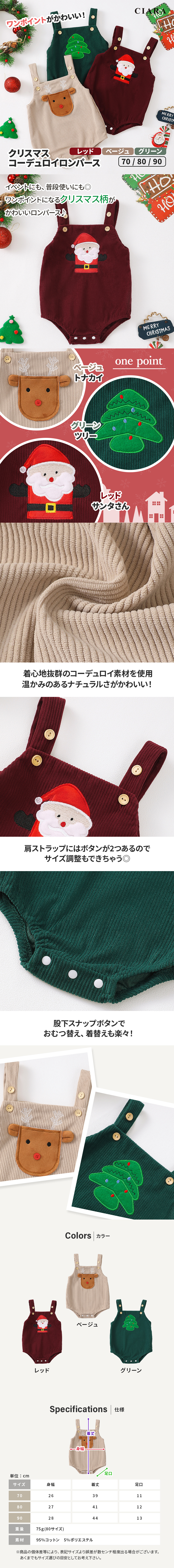 ベビー ロンパース 冬 女の子 男の子 冬服 70 80 クリスマス コーデュロイ ベビー服 オーバーオール 赤ちゃん 服 かわいい クリスマスプレゼント プレゼント tdm