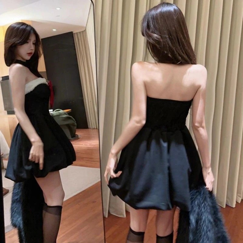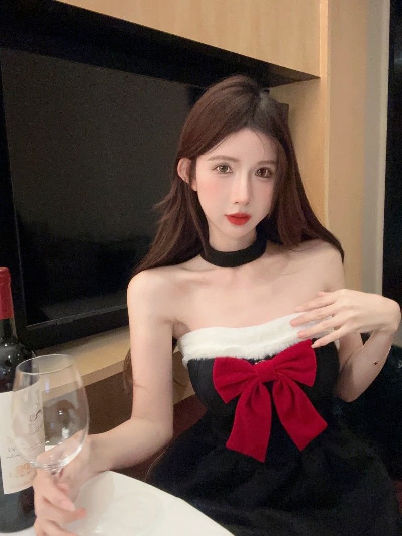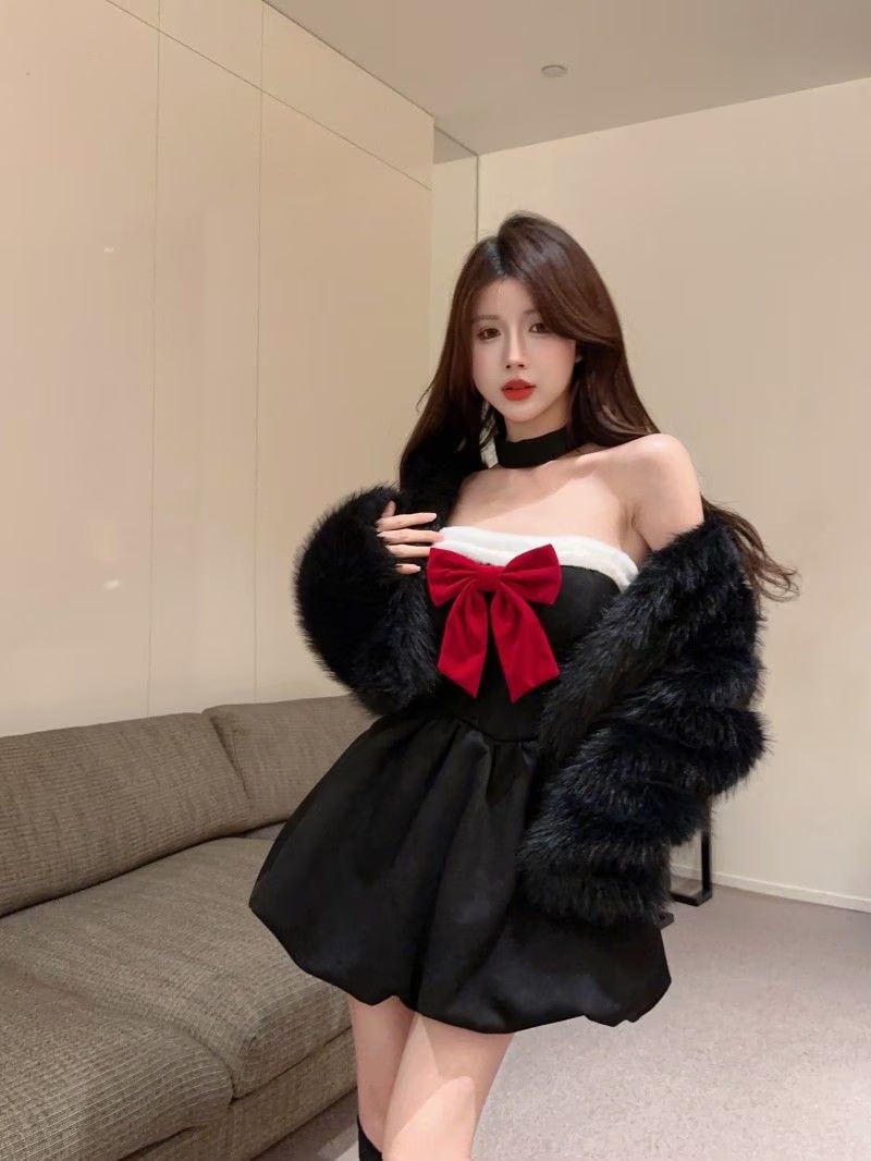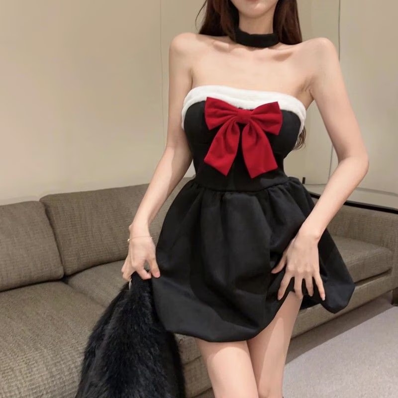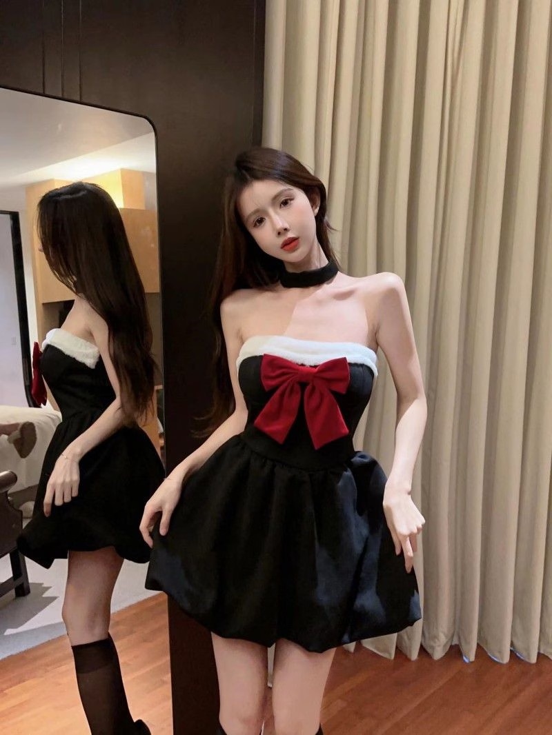 コスプレ ハロウィン コスプレ 純欲風リボン胸拭きワンピース女秋冬クリスマス戦着黒スカート腰ポンポンa字スカート サンタ メイド服 コスプレ ハロウィン