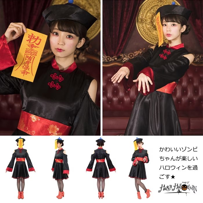 雰囲気抜群のチャイニーズキョンシーコスチューム 中華風のデザインがしっかり作りこまれていて、説得力強め。 黒基調でかっこいい。肩をチラ見せして可愛さもアピール 赤青二色なので、友達と色違いで合わせてもOK 並んでキュートなコスプレアイテムです