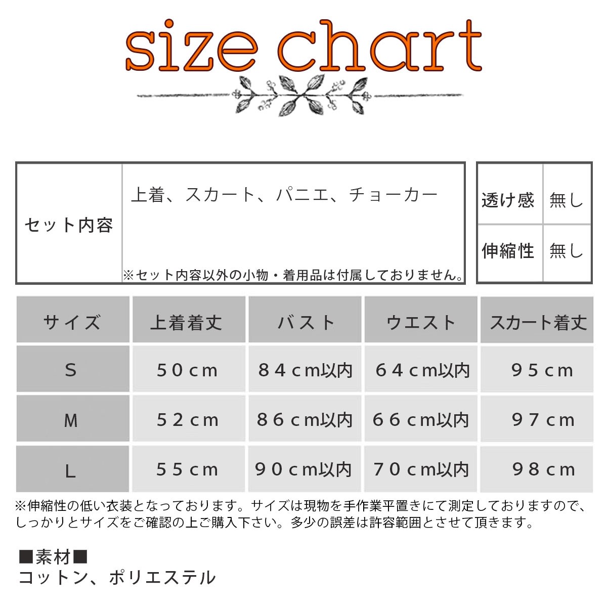 S(上着着丈50cm、バスト84m以内、ウエスト64cm以内、スカート着丈95cm)