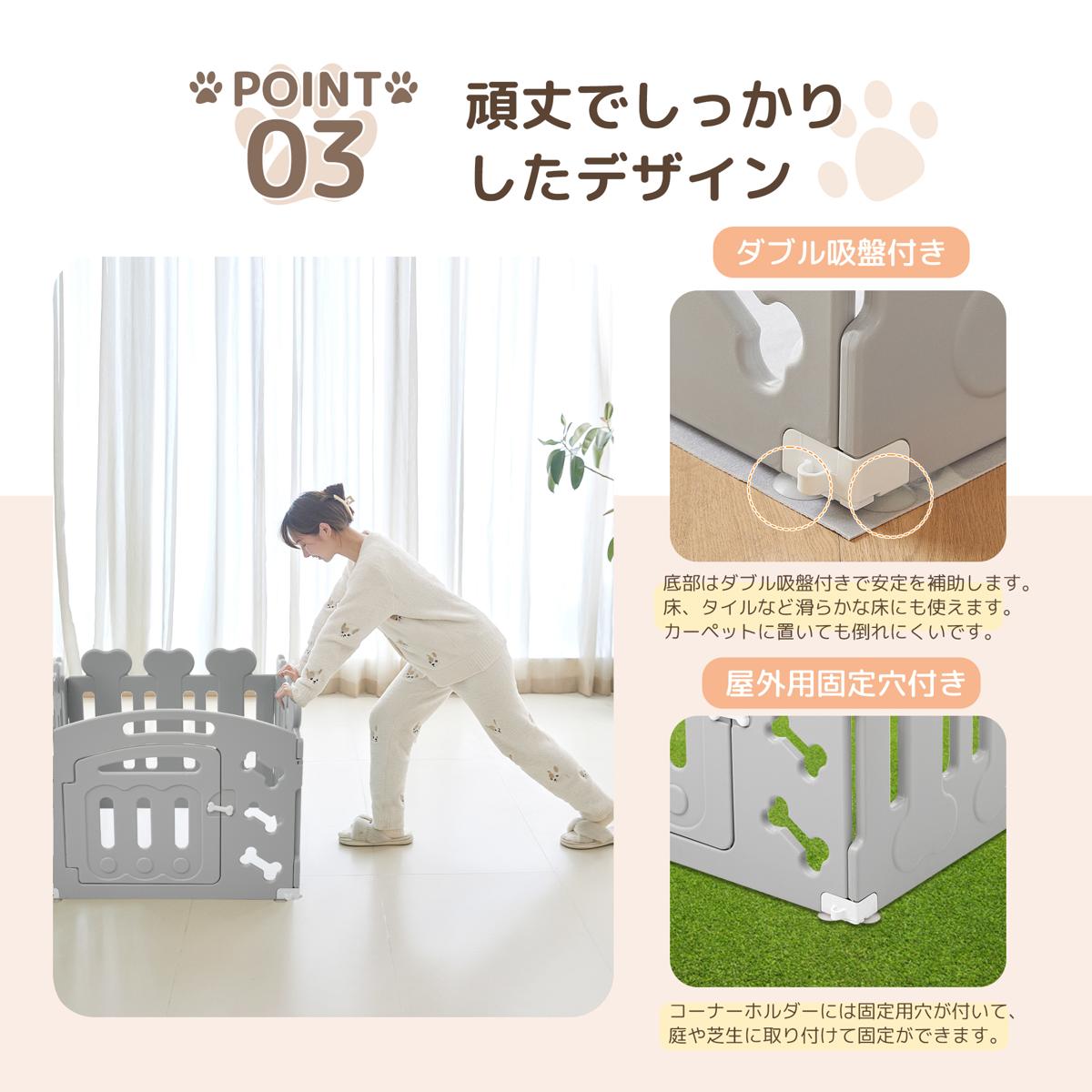 ◆02パネルの高さは62センチで、飼い主さんは出入りしやすい、いつでもペットの状態をチェックできます。ペットにとっても飛び出しにくい十分な高さです。適応対象:子犬・小型犬(肩の高さが35センチ以下の犬)