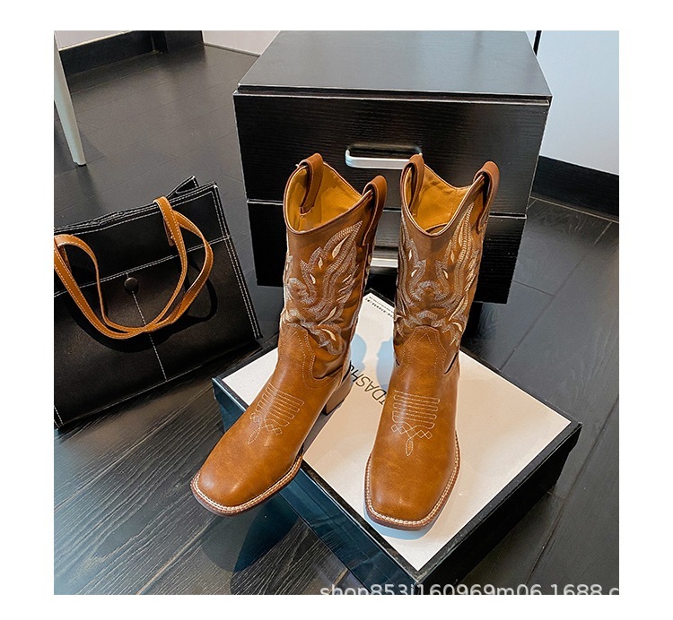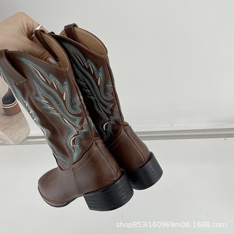 人気ロングブーツ レトロ刺繍2024秋ブラウン太ヒールナイトショートブーツ女 厚底シューズ ショートブーツ レディース ブーティー マーディンブーツ